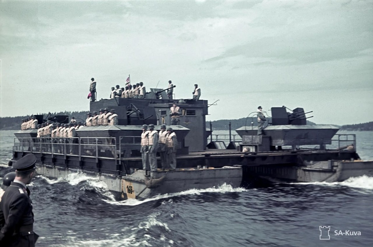 В действительности это были боевые паромы «Зибель», которые были придуманы владельцем и исполнительным директором авиазавода «Siebal» доктором Зибелем для планировавшейся высадки немецких войск в Англии в 1940 г. Они представляли собой простейшую десантную баржу, которая состояла из двух понтонов, соединенных платформой, приводившихся в движение двумя авиационными моторами BMW. В рамках подготовки к новому штурму Ленинграда немецкое командование решили создать на озере флотилию, получившую название Боевой паромный штаб «Ост». Интересно, что она входила в состав авиации (Люфтваффе), а не немецкого ВМФ, и даже команды паромов состояли не из моряков, а были укомплектованы пехотинцами из авиаполевых дивизий и зенитчиками. Ну а главной задачей этого флота было нарушение работы Дороги жизни, водной коммуникации, по которой доставлялись грузы в блокадный Ленинград. Первый выход паромов к трассе состоялся в ночь на 25 августа, второй - через пять дней, однако ни одной цели обнаружено не было. В ночь на 1 октября флотилия впервые столкнулась в озере с советскими кораблями, но наши вовремя открыли огонь, поставили дымовую завесу и прикрыли баржи с грузами.