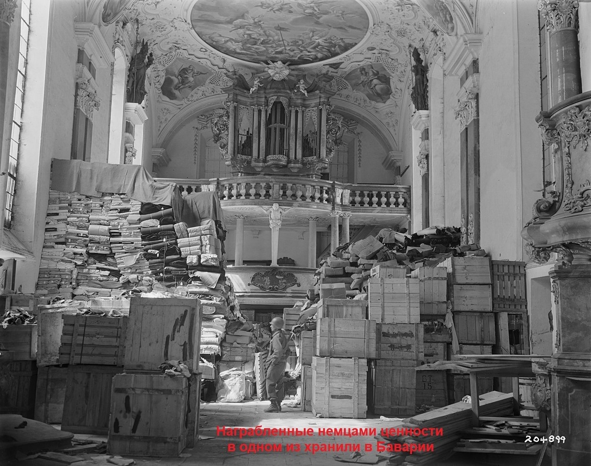 Примерно такая же участь тотального разграбления ждала и Советский Союз. К счастью, руководство страны заблаговременно позаботилось о спасении многих культурных ценностей. К примеру, мобилизационные планы эвакуации наиболее ценных экспонатов из дворцовых комплексов Пушкина, Петергофа и Эрмитажа (бывшего Зимнего дворца) были подготовлены задолго до войны. Это позволило начать работы немедленно, уже 23 июня 1941 г., хотя в тот момент никто всерьез не верил в то, что противник дойдет до Ленинграда. Заранее были определены и точки эвакуации, а также места временного хранения ценностей. 30 июня в Горький (ныне Нижний Новгород) была отправлена первая партия в количестве 1928 экспонатов. До конца лета на восток отбыло еще четыре эшелона, еще одну большую группу экспонатов вывезли на грузовиках в г. Ленинград. Параллельно проводились большие работы по консервации дворцов и защите их от пожаров. Часть парковых статуй и вовсе была захоронена в земле и замаскирована. А вот знаменитую Янтарную комнату эвакуировать не стали, снять янтарные панно без значительных повреждений оказалось невозможно. Вместо этого панно заклеили марлевой тканью и закрыли чехлами из ватина. Окна Янтарного зала зашили двумя рядами толстых досок, а пространство между ними заполнили песком.